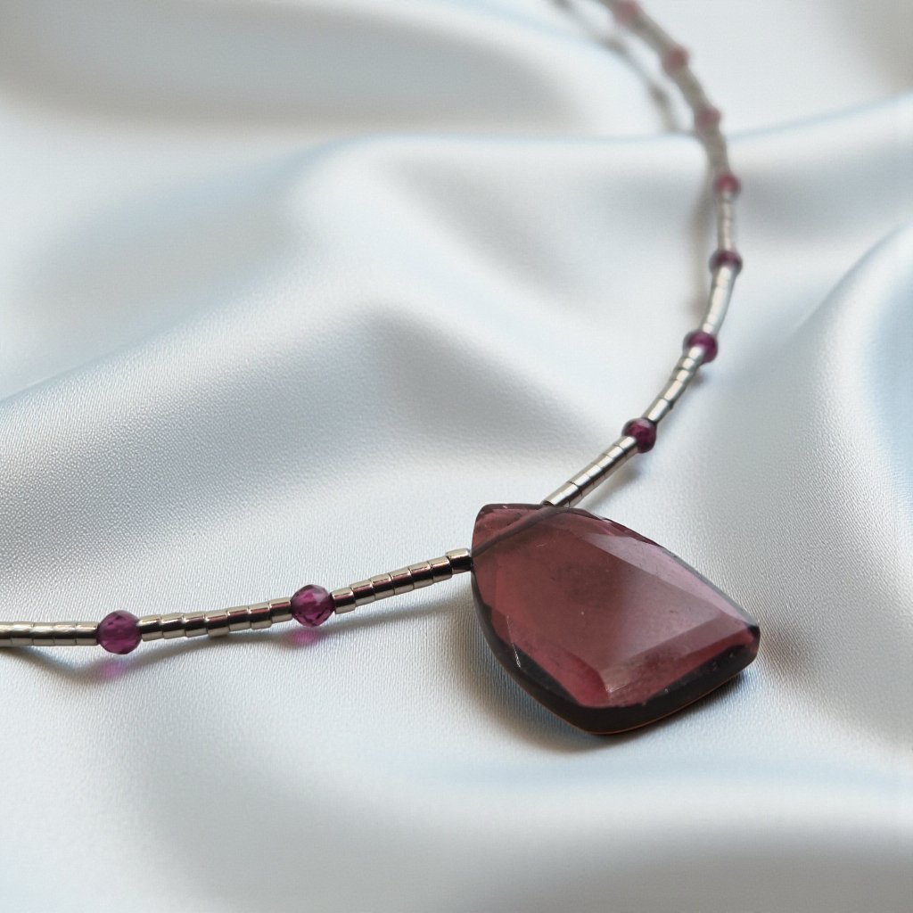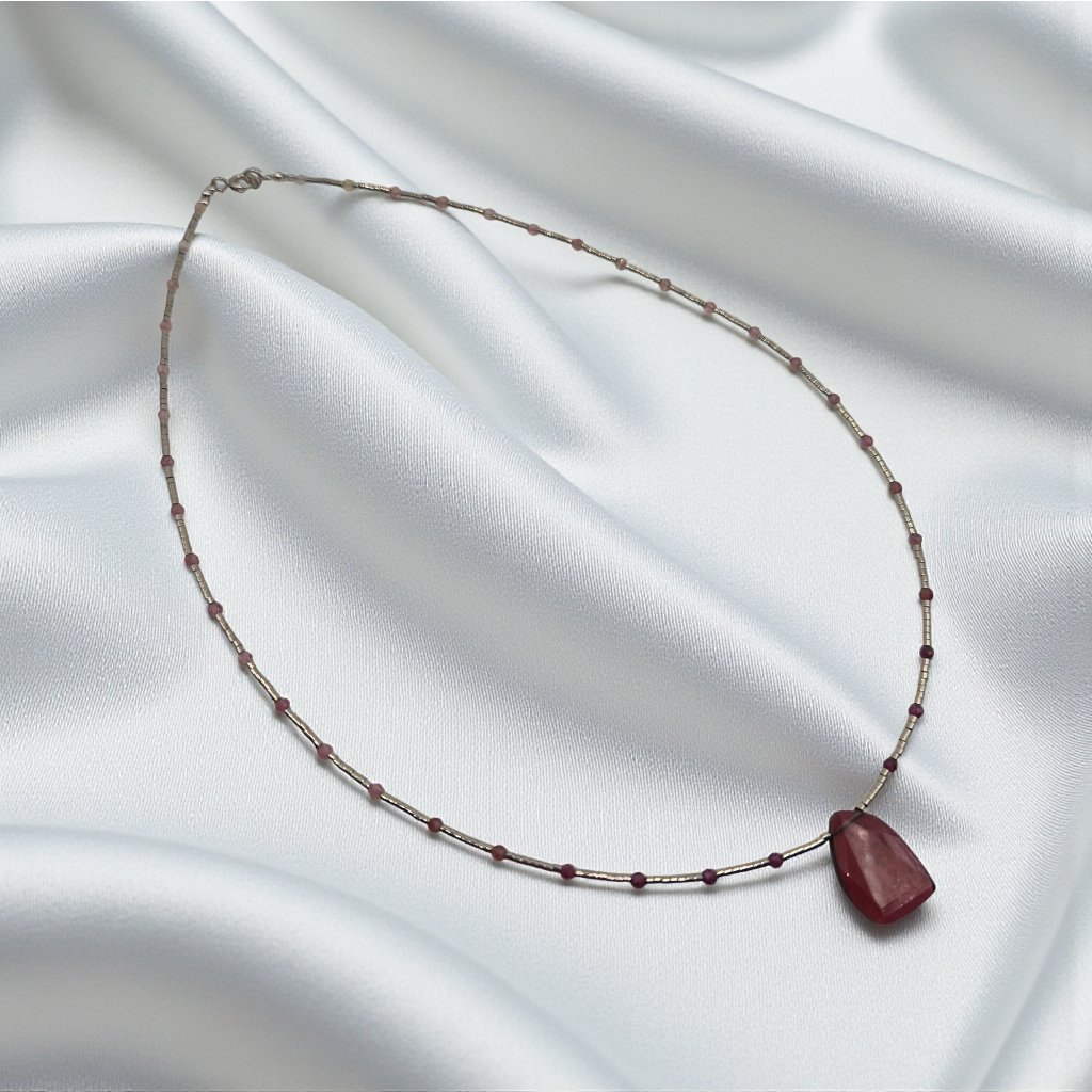 Náhrdelník s granátem a přívěskem růže z nerezové oceli s rhodiovanou úpravou. Smyslný šperk, který propojuje sílu emocí s jemnou elegancí.