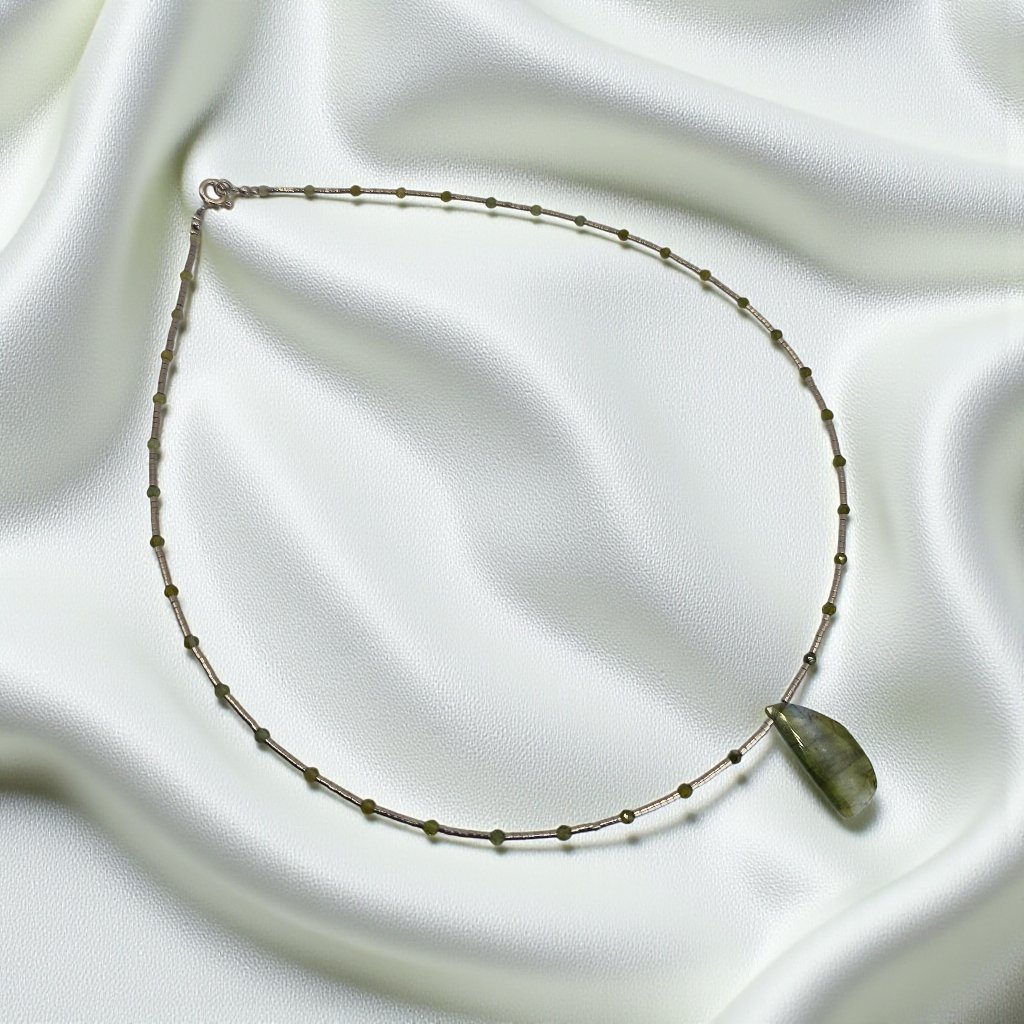 Elegantní náhrdelník s tmavě zeleným přívěškem turmalínu z Indie.