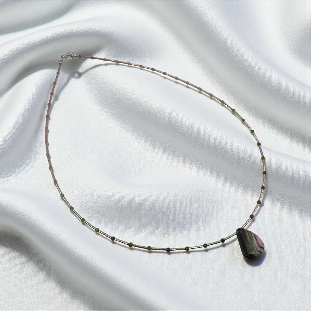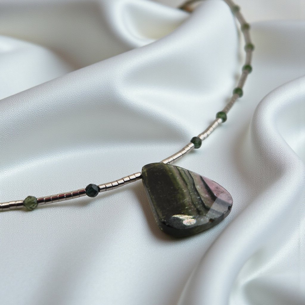 Jemný a nadčasový náhrdelník, který staví do popředí přirozenou krásu turmalínu. Minimalistický design nechává vyniknout samotný kámen a jeho jedinečný charakter. Šperk působí klidně, vyváženě a přirozeně- je určený pro každodenní nošení i výjimečné chvíle.