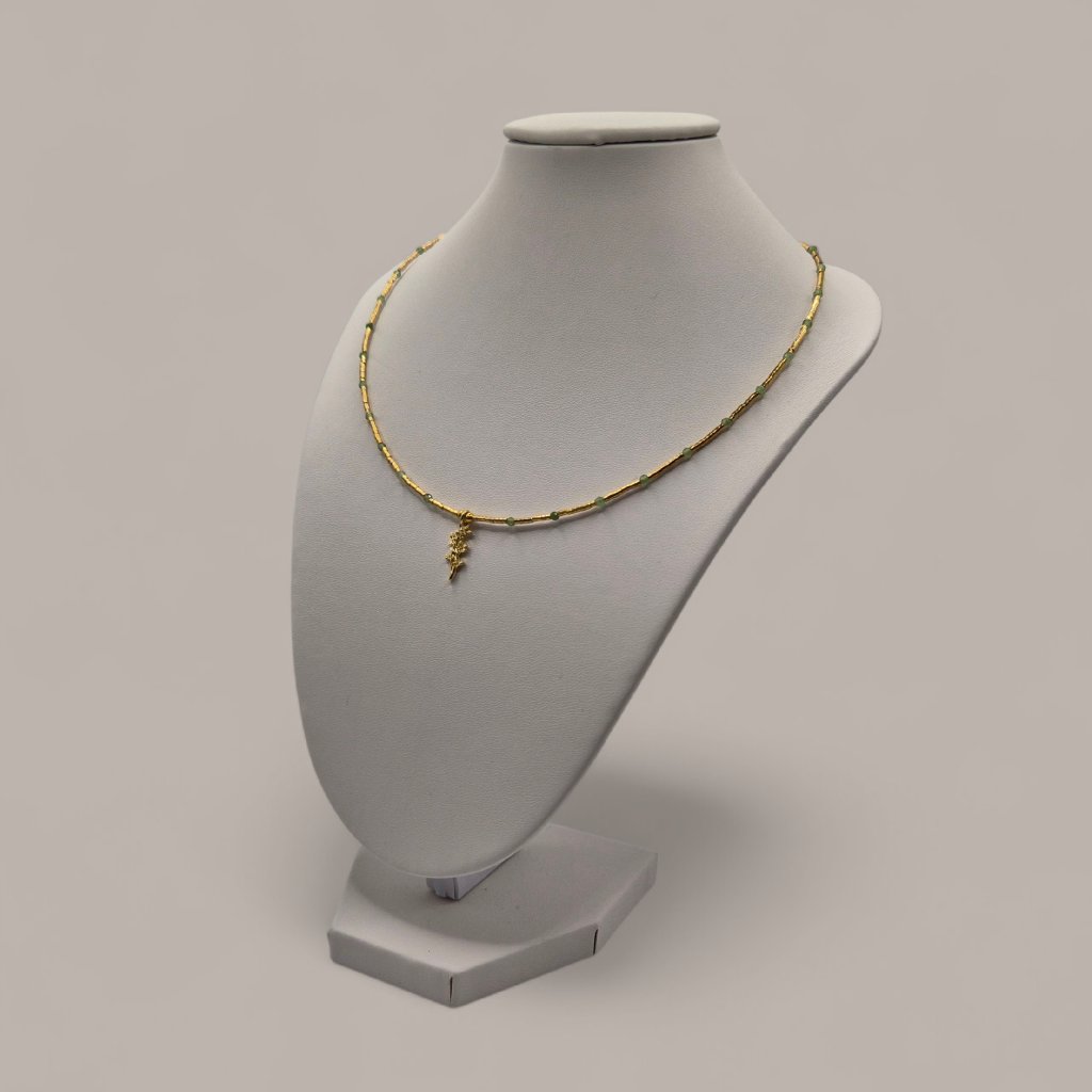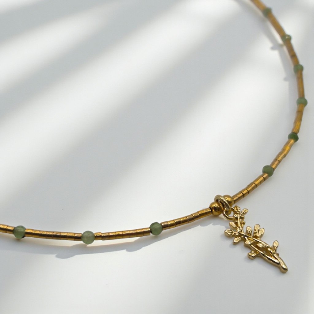 Náhrdelník inspirovaný silou přírody, který propojuje harmonii a ochranu s jemným, minimalistickým vzhledem. Dominantním prvkem je přívěsek ve tvaru cesmíny, symbolu odolnosti a vnitřní stability. Přívěsek je vyrobený ze základní mosazi a pozlacený 18kt zlatem, což mu dodává elegantní vzhled i výbornou odolnost. V kombinaci se světle zeleným jadeitem působí šperk klidně, vyrovnaně a žensky.