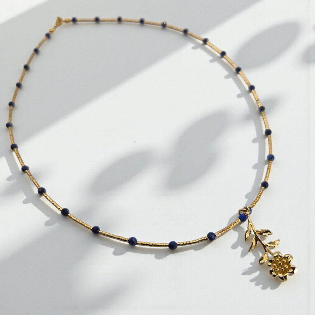 Náhrdelník s lapisem lazuli a květem povijnice. Šperk pro vnitřní klid, intuici a sebevyjádření.