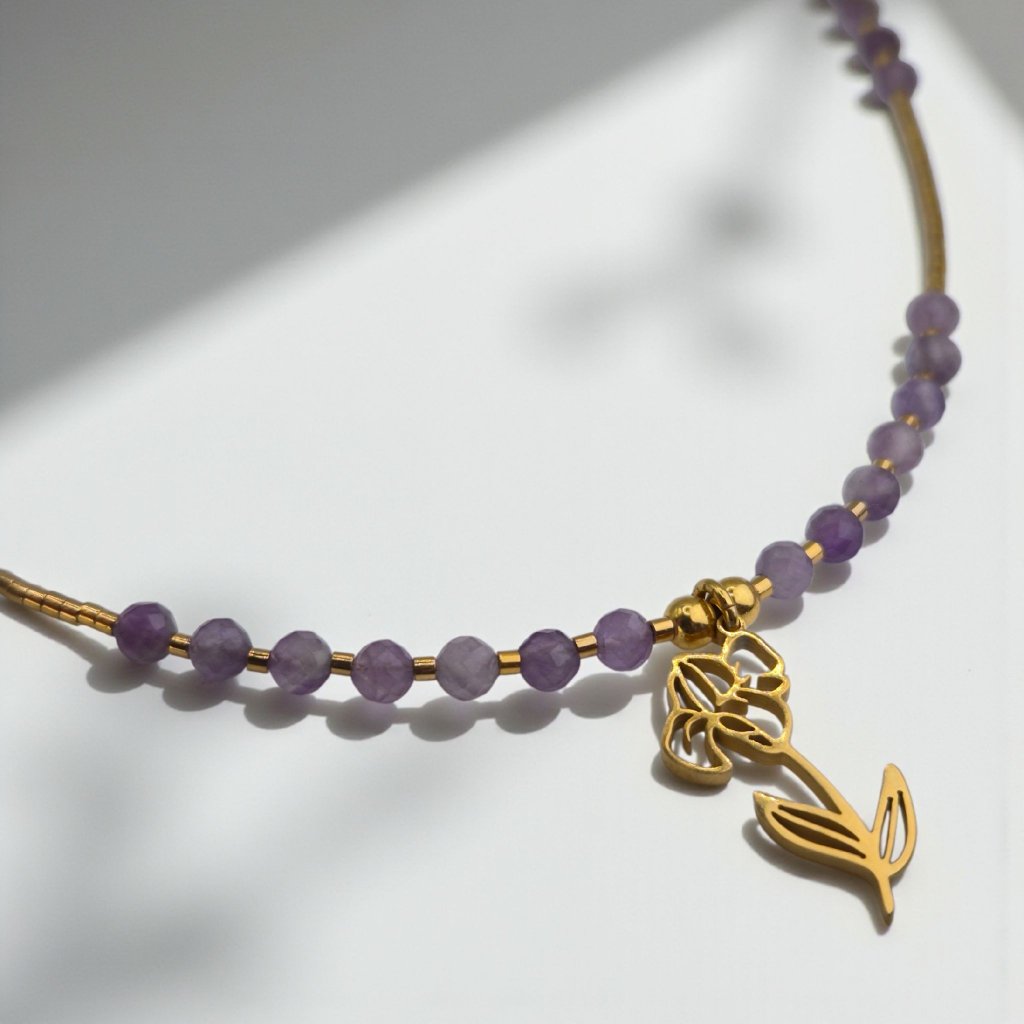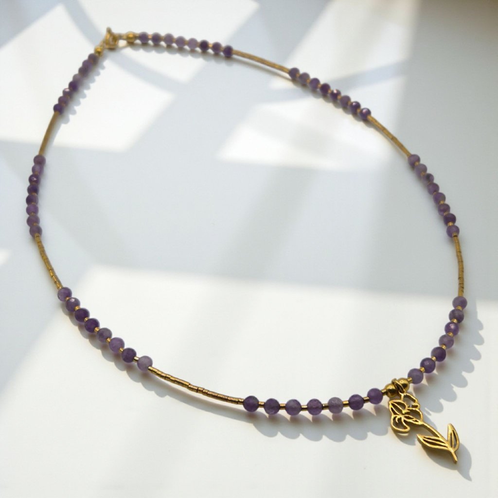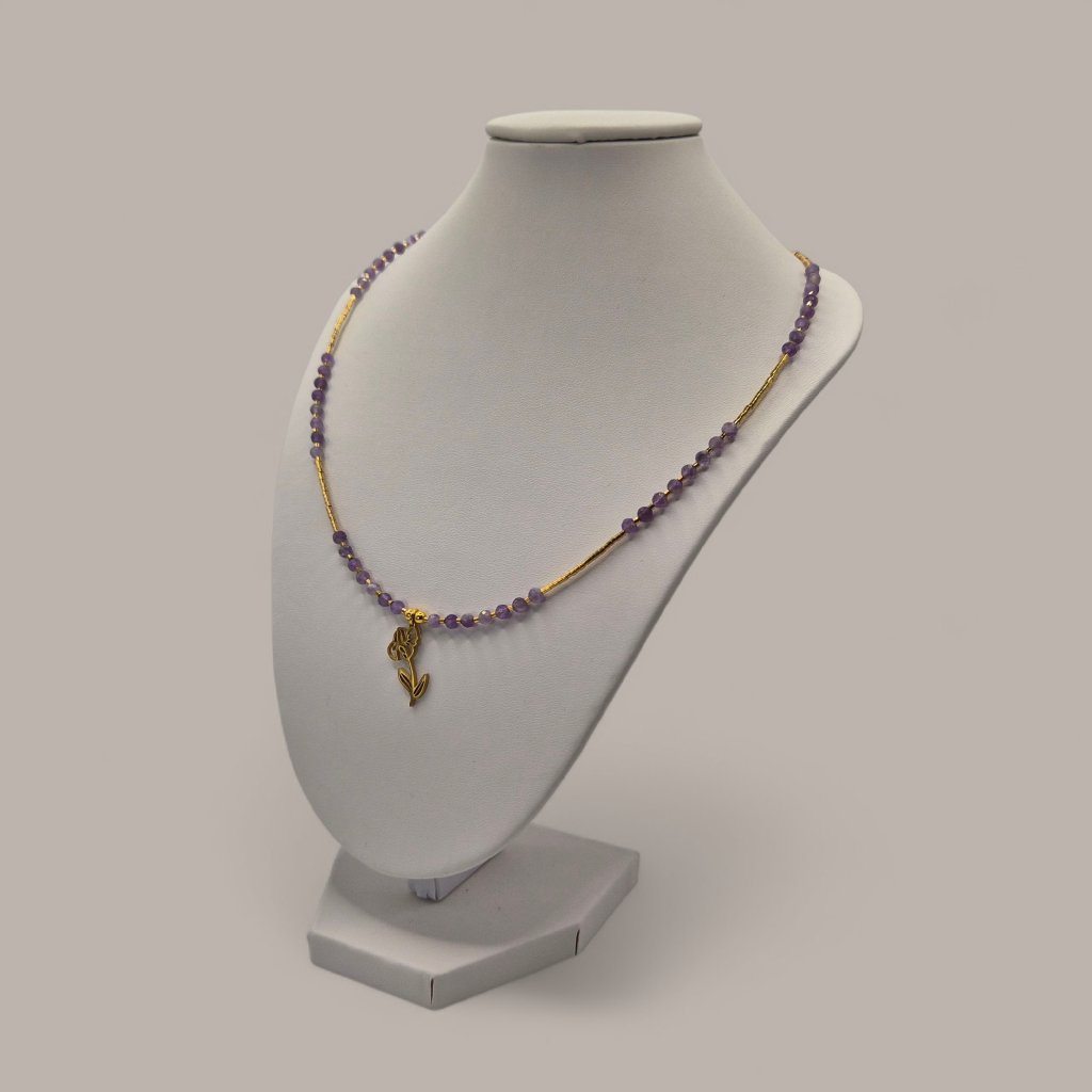 Elegantní a jemný náhrdelník, který v sobě spojuje krásu přírodních kamenů a minimalistický design. V hlavní roli září broušený ametyst v tónech fialové – barvy duchovna, klidu a vnitřní síly. Náhrdelník nese název Kosatec jako symbol elegance, intuice a tvořivosti.