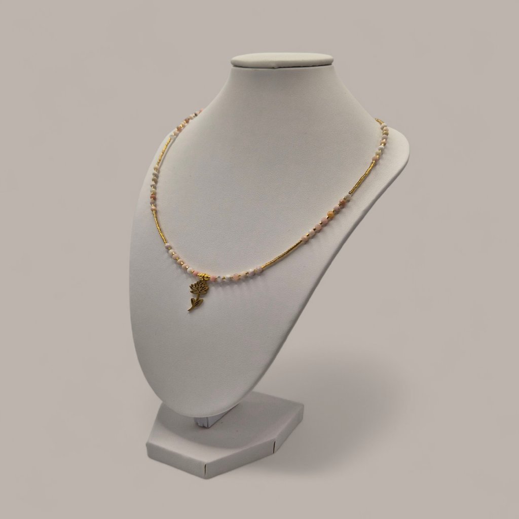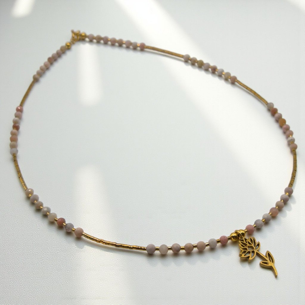 Jemný a harmonický šperk, který propojuje křehkost přírody s hloubkou ženské energie. Dominantním prvkem je pozlacený přívěsek ve tvaru leknínu, symbolu klidu, obnovy a čistoty. V kombinaci s růžovým opálem vzniká elegantní náhrdelník, který ti připomene, že síla často přichází v tichosti.
