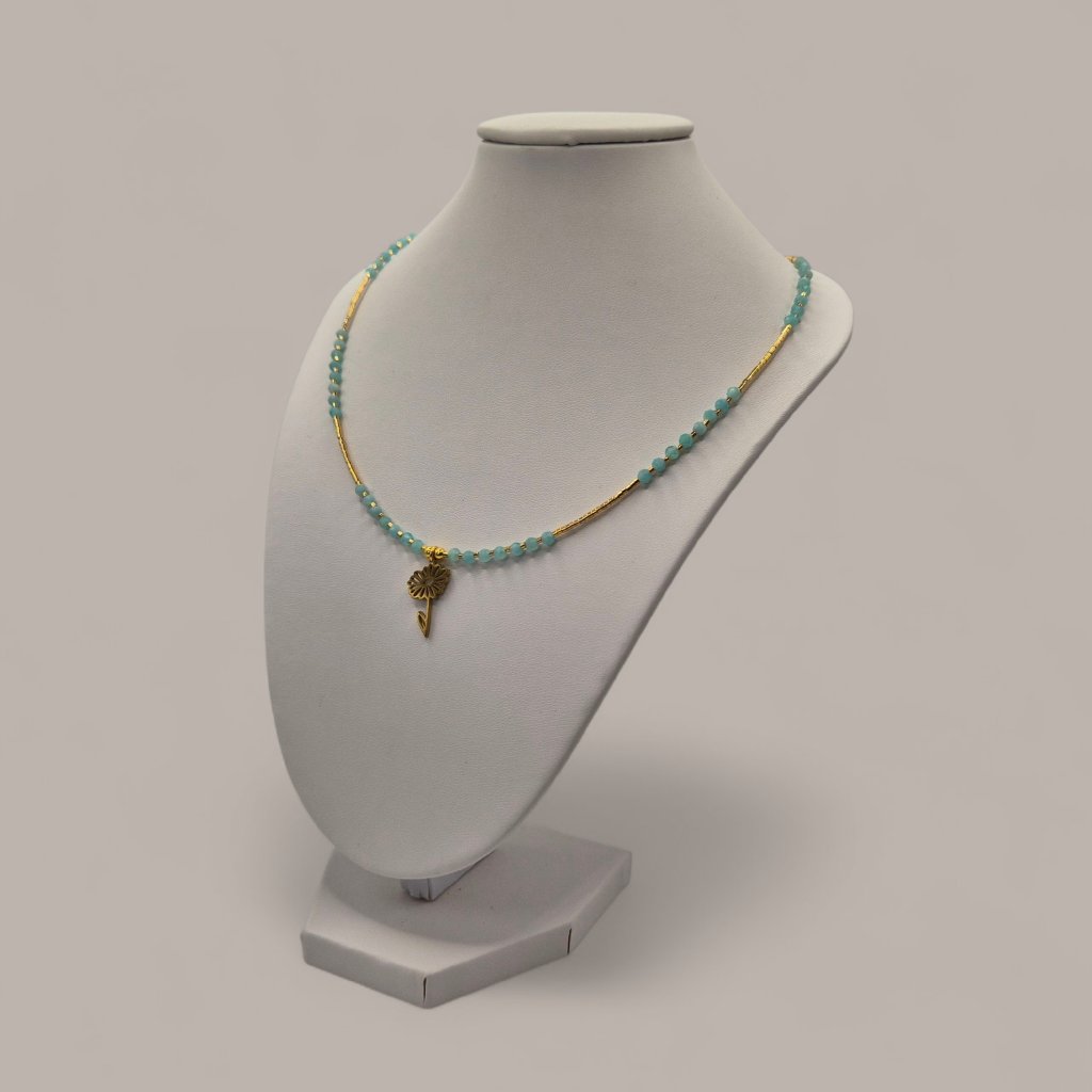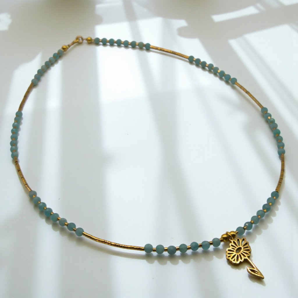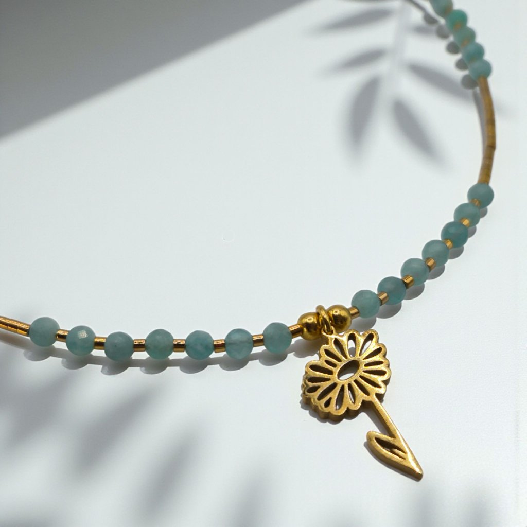Jemný, hravý a svěží šperk, který odráží krásu v jednoduchosti. Dominantním prvkem je pozlacený přívěsek ve tvaru květu sedmikrásky, symbolu nevinnosti, čistoty a radosti ze života. V kombinaci s amazonitem vzniká něžný náhrdelník, který propojuje ženskou lehkost s vnitřním klidem.