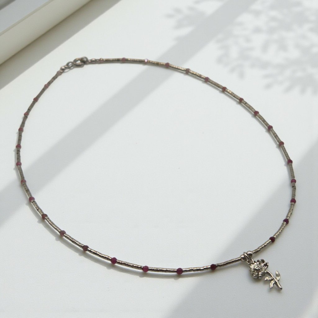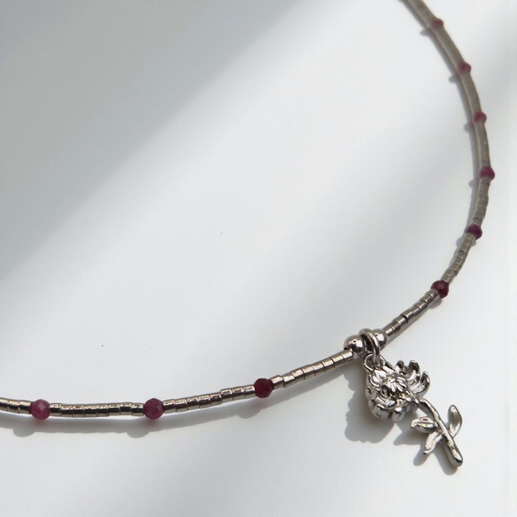 Náhrdelník, který v sobě nese jemnost i hloubku – stejně jako květ chryzantémy, symbolizující sílu, vnitřní stabilitu a ženskou odolnost. Dominantním prvkem je přívěsek ve tvaru květu chryzantémy s rhodiovanou povrchovou úpravou, která mu dodává decentní stříbrný lesk a zajišťuje dlouhodobou odolnost. V kombinaci s růžovým turmalínem vzniká harmonický a přirozeně elegantní šperk s jemným přechodem barevných tónů – od nejsvětlejší růžové po sytě malinovou.