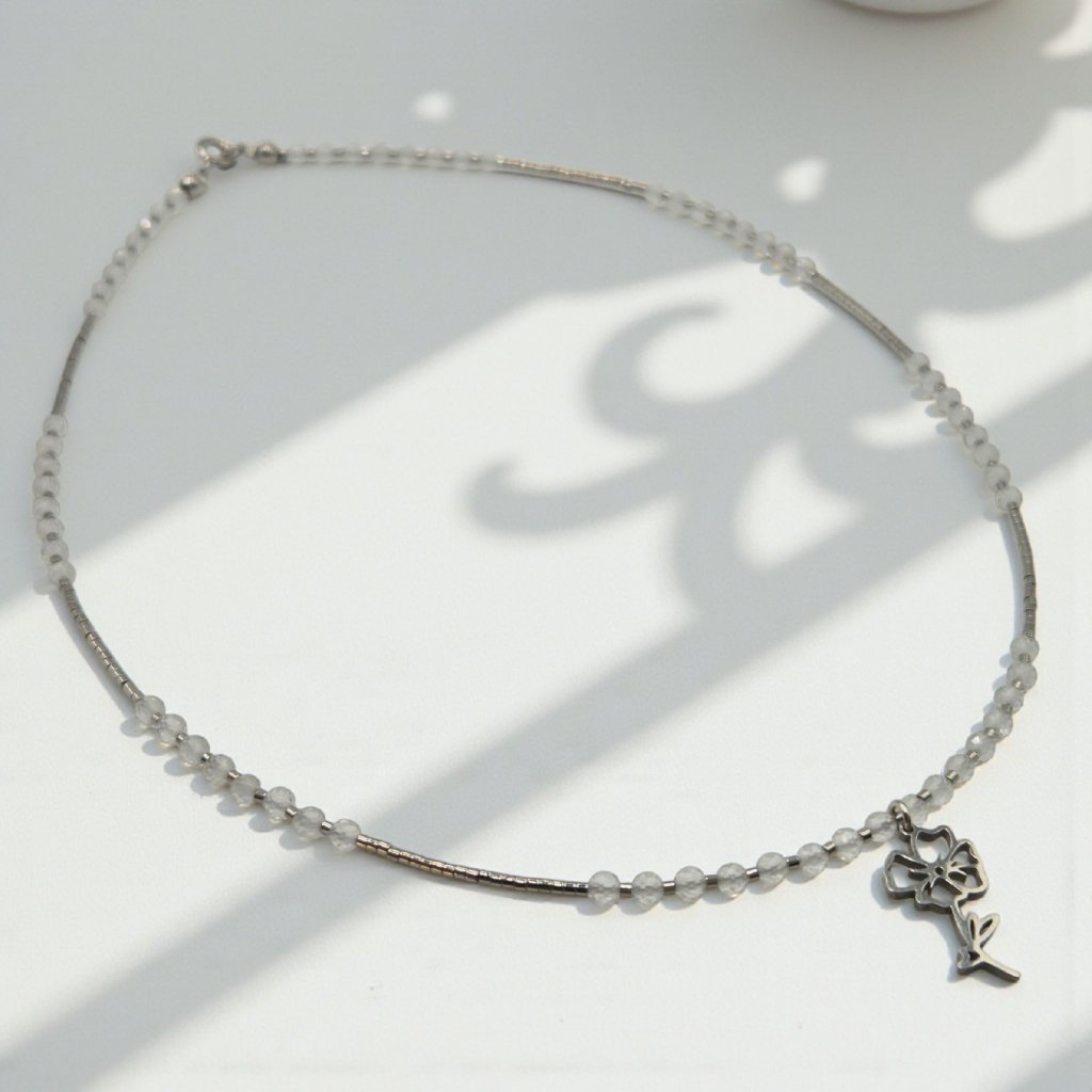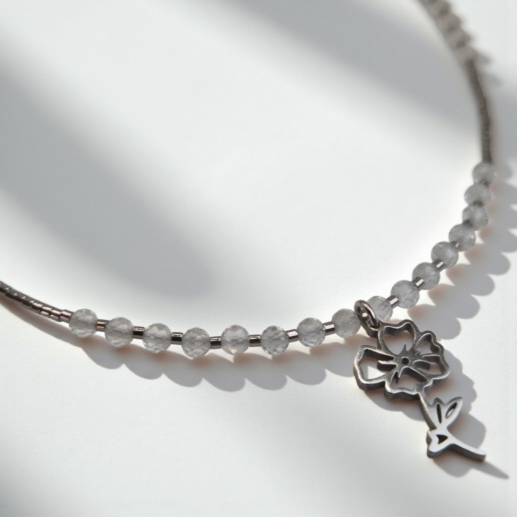 Náhrdelník s růžovým turmalínem z Brazílie a přívěskem chryzantémy z nerezové oceli s rhodiovanou úpravou. Elegantní šperk, který propojuje jemnost, sílu a ženskou vyrovnanost.