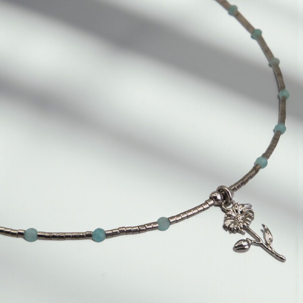Jemný a hravý náhrdelník inspirovaný svěžestí léta a radostí z přítomného okamžiku. Dominantním prvkem je přívěsek ve tvaru kopretiny, symbolizující čistotu, radost a lehkost bytí. Jeho rhodiovaná povrchová úprava mu dodává decentní stříbřitý lesk a chrání ho před zmatněním i poškrábáním. V kombinaci s amazonitem vzniká šperk, který působí klidně, uvolněně a nese v sobě jemnou vnitřní rovnováhu.