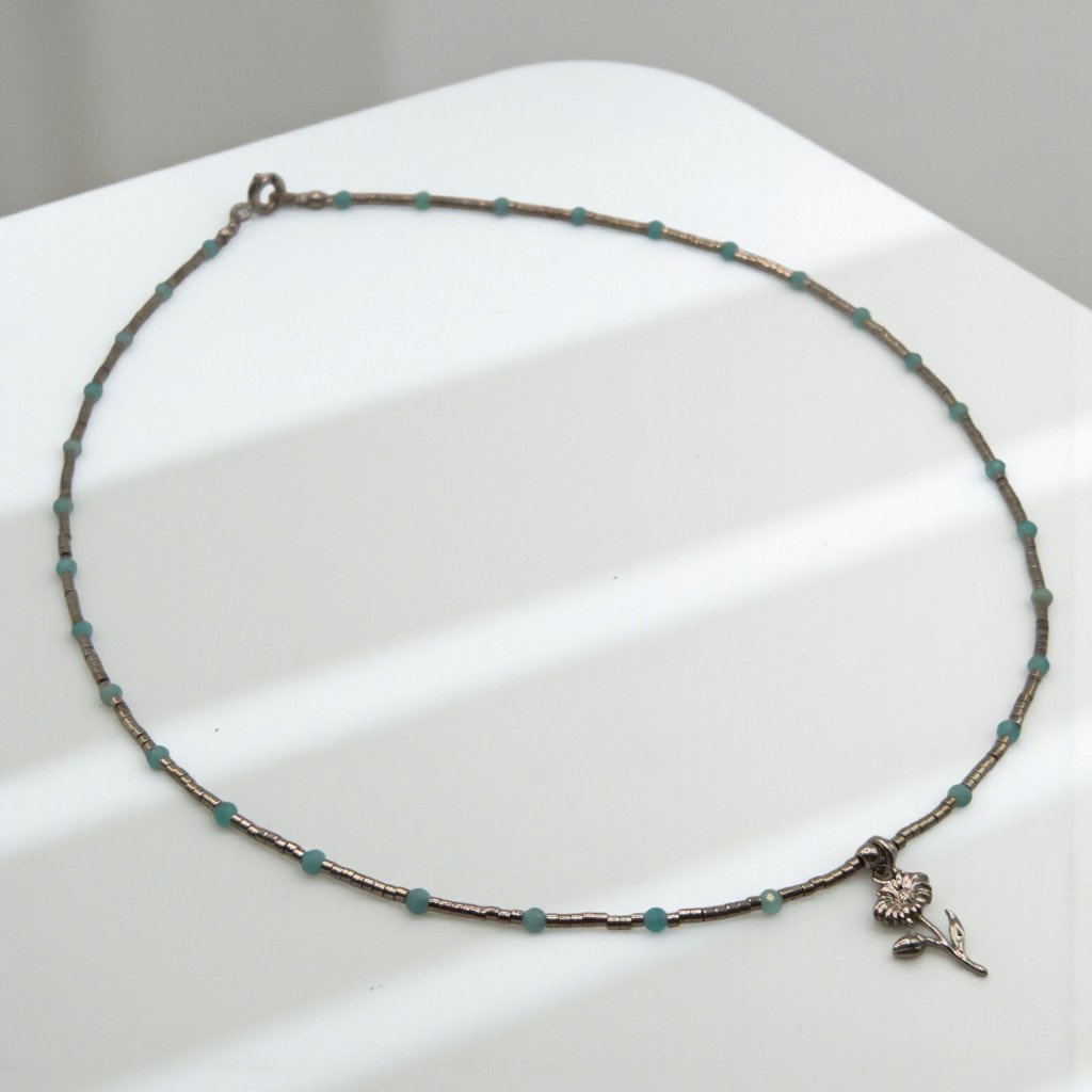 Náhrdelník s amazonitem a přívěskem kopretiny. Jemný šperk pro klid, rovnováhu a radost v každém dni.