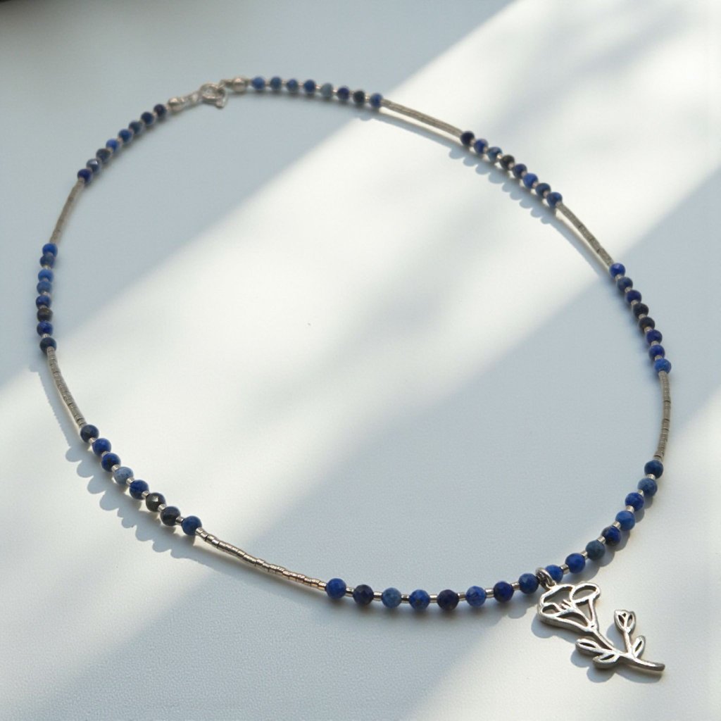 Náhrdelník s lapisem lazuli a přívěskem povijnice. Elegantní šperk pro autenticitu, klid a vnitřní jasnost.