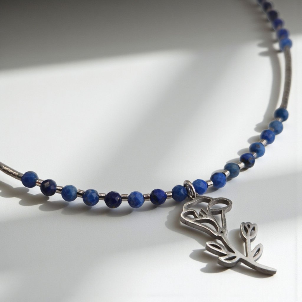 Náhrdelník, který působí klidně, hluboce a vyrovnaně – stejně jako květ povijnice, symbol jemnosti a tiché síly. Přívěsek ve tvaru povijnice je vyroben z nerezové oceli s rhodiovanou povrchovou úpravou, která mu dodává chladivý lesk, a zároveň zajišťuje vysokou odolnost vůči opotřebení i zmatnění. V kombinaci s výrazným lapisem lazuli vzniká šperk, který je jemný, ale s charakterem – ideální pro ženy, které nacházejí sílu v klidu.