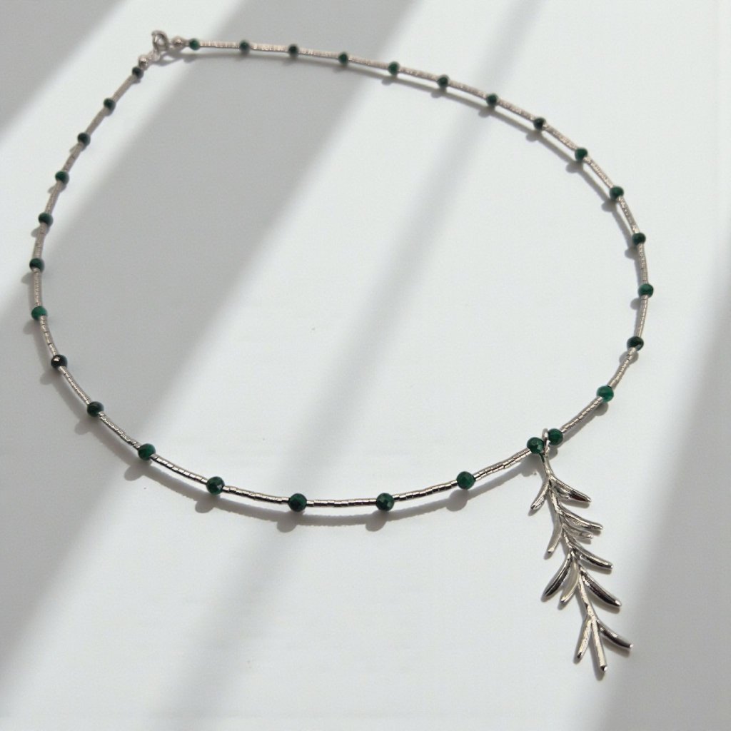 Rhodiovaný náhrdelník rozmarýn a malachit - mosazný přívěsek, stříbrné komponenty (Ag 925)