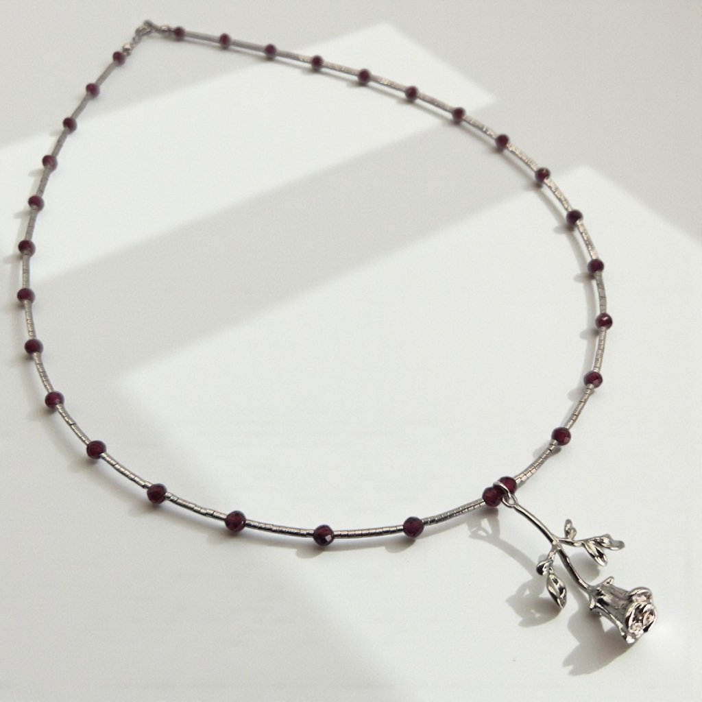 Rhodiovaný náhrdelník růže a granát - mosazný přívěsek, stříbrné komponenty (Ag 925)