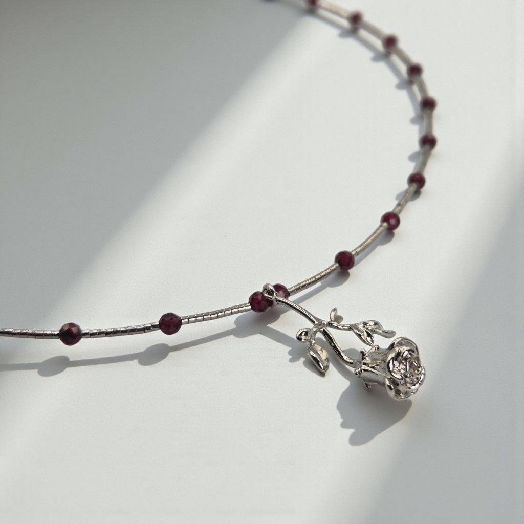 Granát je přírodní minerál s intenzivní barvou, která se pohybuje od tmavě vínové po červenohnědou. Odedávna je považován za kámen vášně a životní síly. Pomáhá posilovat energii, soustředění a vnitřní rovnováhu. V kombinaci s motivem růže představuje spojení srdce a síly – symbol ženské energie, která je klidná, ale nekompromisní.