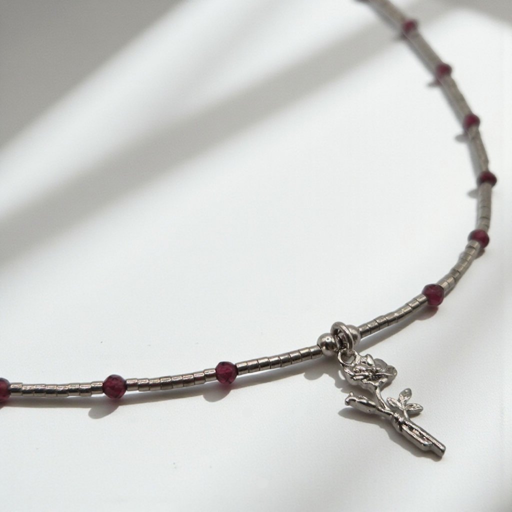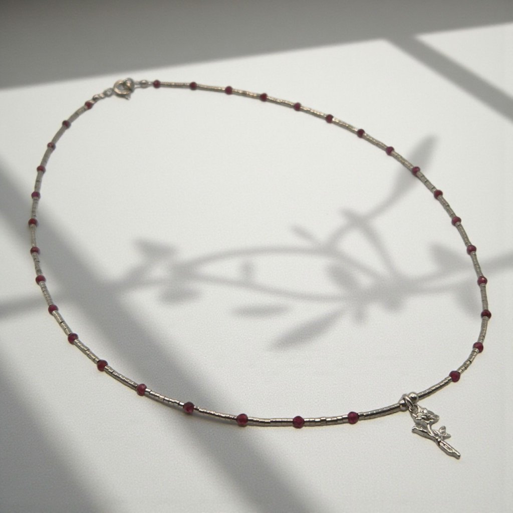 Náhrdelník, který v sobě nese hloubku emocí, vášeň i jemnost. Dominantním prvkem je přívěsek ve tvaru růže, symbolu lásky, síly a ženské krásy. Jeho rhodiovaná povrchová úprava dodává šperku elegantní, chladivý lesk a zároveň chrání před opotřebením. V kombinaci s granátem vzniká šperk, který působí výrazně a smyslně, přesto si zachovává jemnost a čistý design.