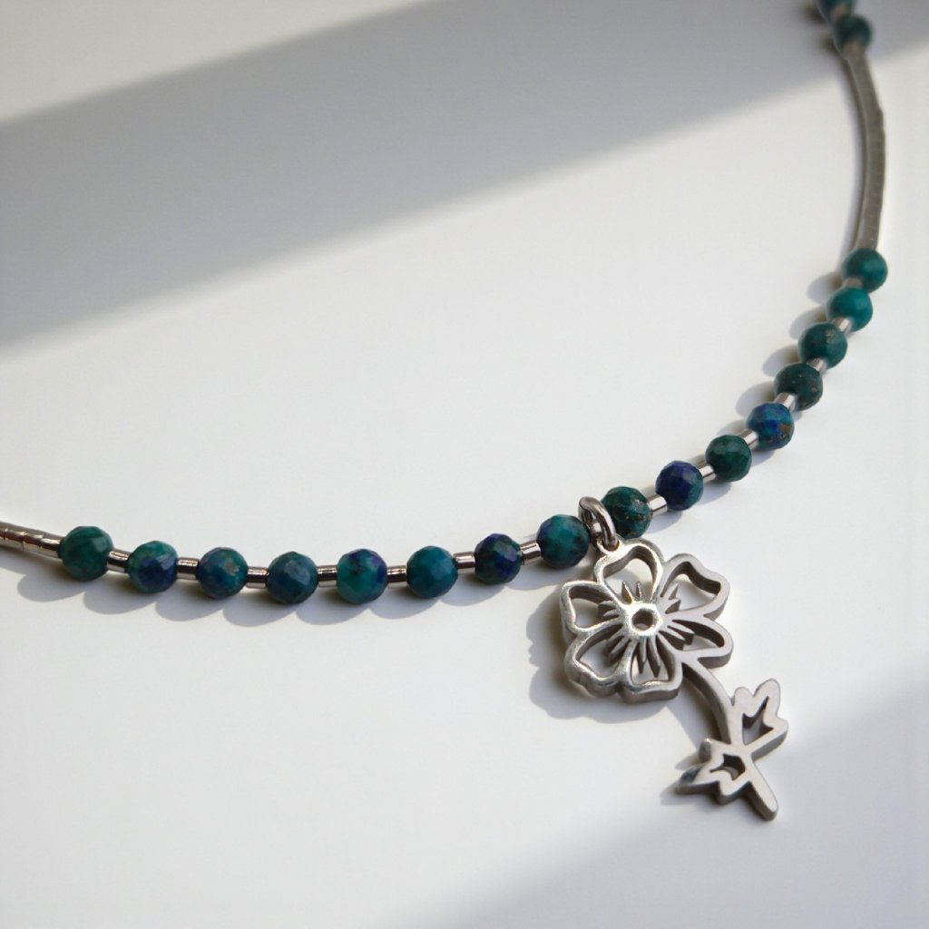 Rhodiovaný náhrdelník sasanka a chryzokol - nerezový přívěsek, stříbrné komponenty (Ag 925)