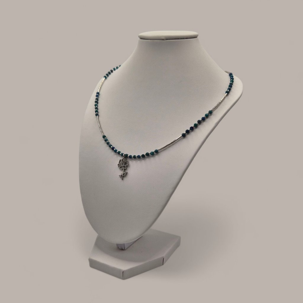 Chryzokol je minerál spojovaný s klidem, komunikací a sebepřijetím. Pomáhá uvolňovat stres, harmonizovat emoce a podporuje vnitřní stabilitu. Použité broušené korálky o velikosti 3 mm pocházejí z Afriky a mají krásné přechody odstínů – od tyrkysové přes mořskou modř až po zemitě zelené tóny. Fasetovaný povrch dodává kamínkům jemný lesk, který podtrhuje přírodní krásu chryzokolu a ladí s rhodiovaným kovem.