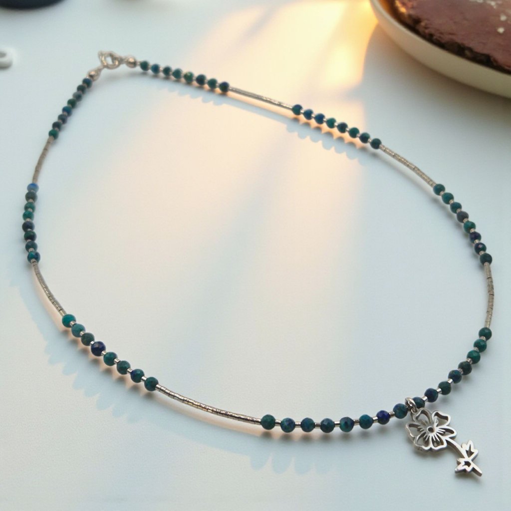 Náhrdelník s lapisem lazuli a květem povijnice. Šperk pro vnitřní klid, intuici a sebevyjádření.