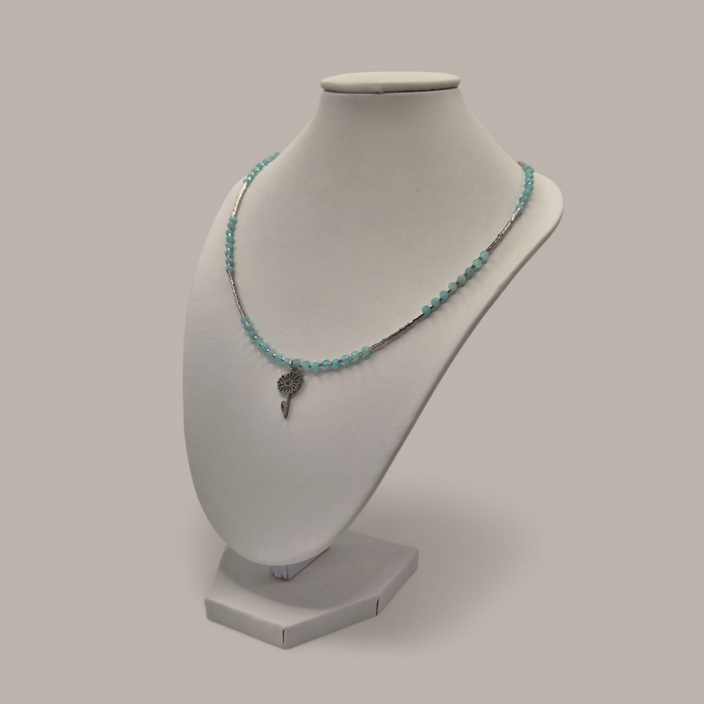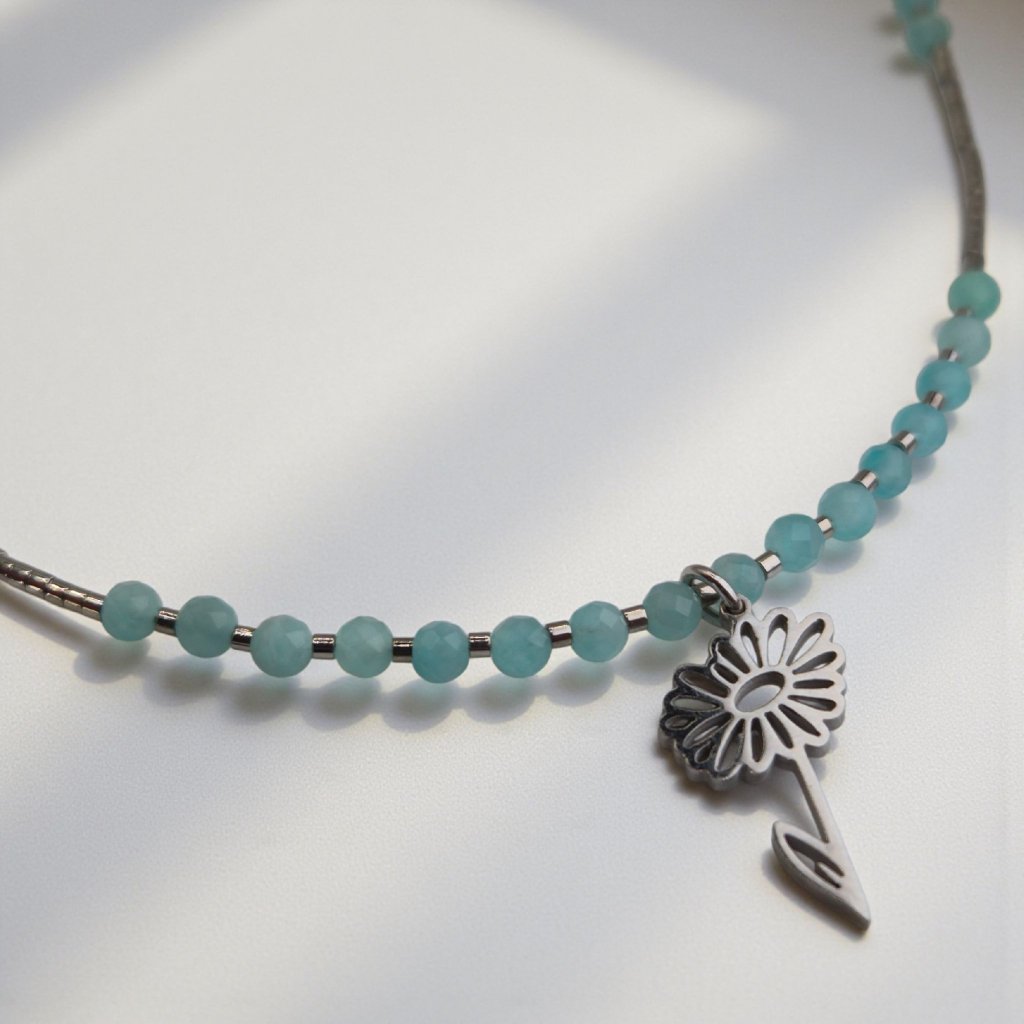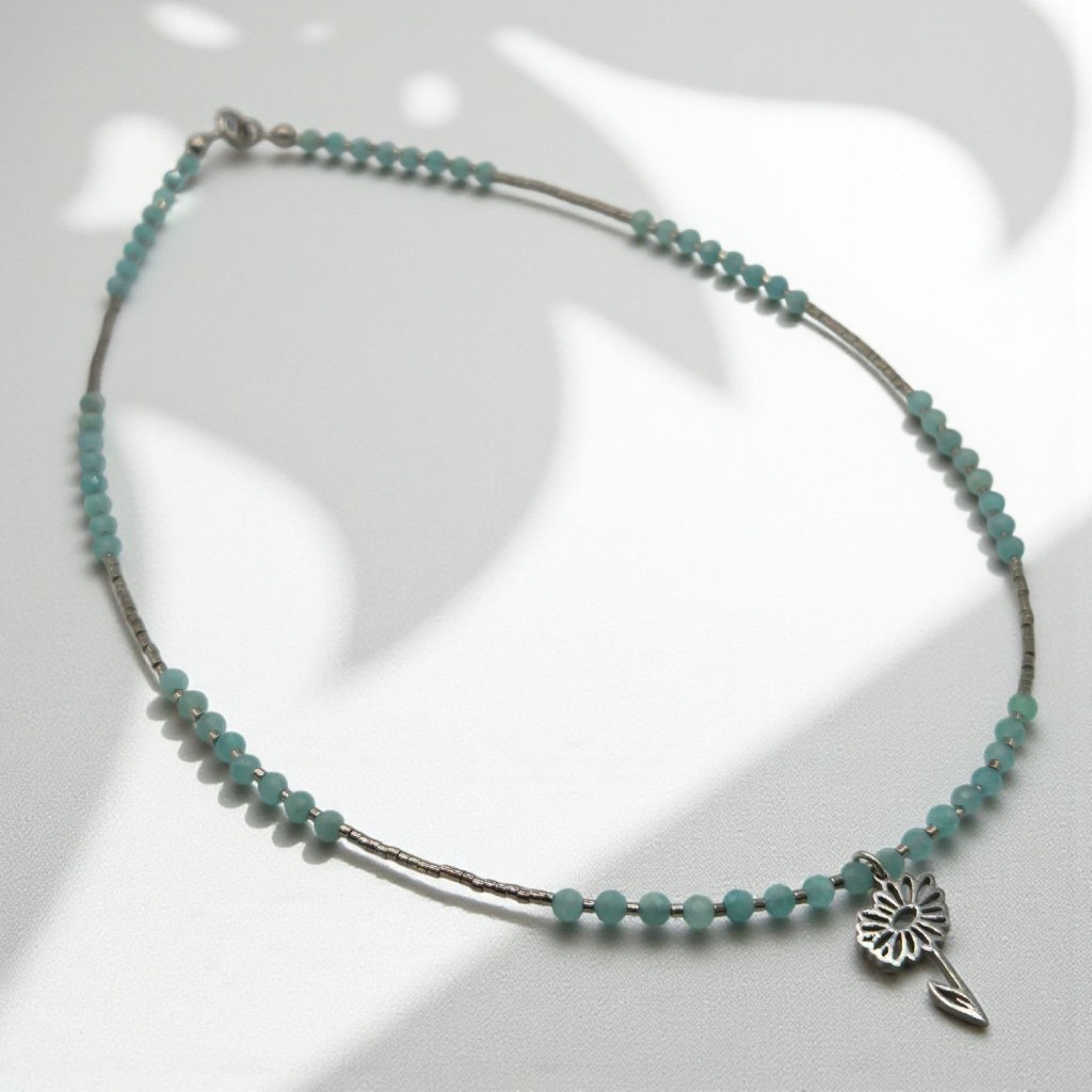 Náhrdelník s amazonitem a přívěskem kopretiny. Jemný šperk pro klid, rovnováhu a radost v každém dni.