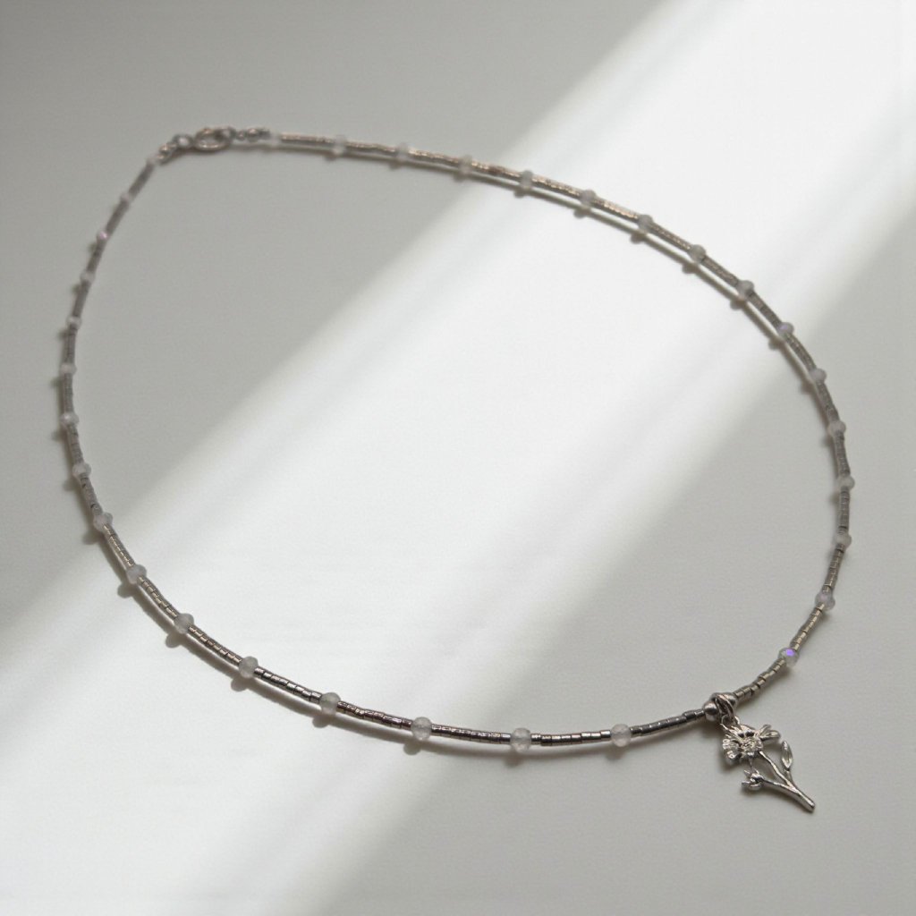 Náhrdelník s apatitem z Myanmaru a přívěskem sněženky. Jemný šperk, který přináší svěžest, nový začátek a lehkost bytí.