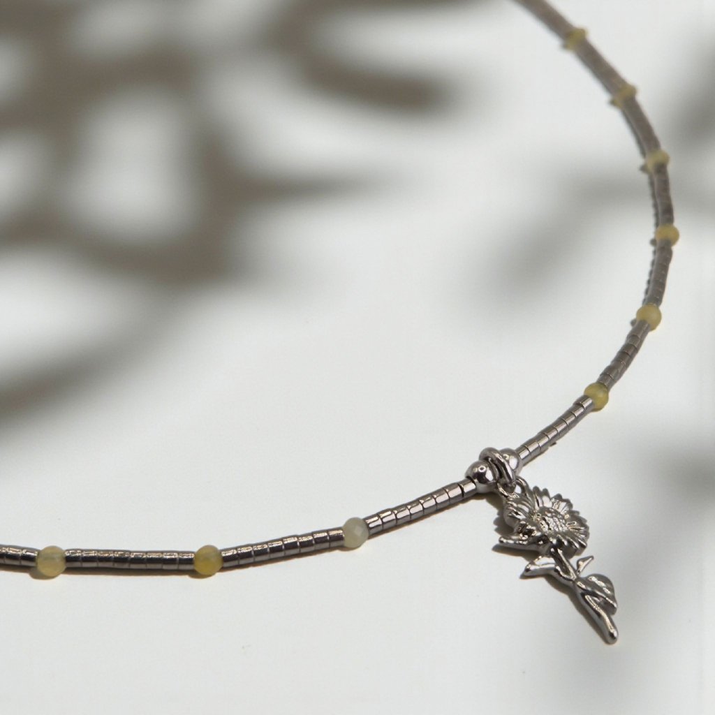 Zářivý a pozitivně laděný náhrdelník inspirovaný světlem, sluncem a radostí. Dominantním prvkem je přívěsek ve tvaru slunečnice, květu, který symbolizuje vitalitu, teplo a otevřenost k životu. Jeho rhodiovaná povrchová úprava mu propůjčuje elegantní stříbřitý lesk a dlouhou životnost. V kombinaci se žlutým opálem vzniká šperk, který přirozeně rozjasní každý den – jemně, ale s charakterem.