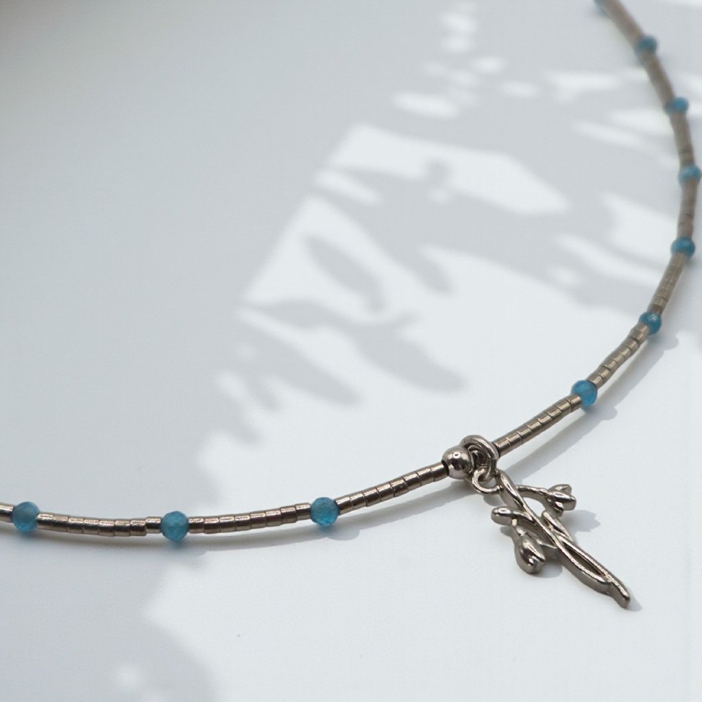 Náhrdelník s apatitem z Myanmaru a přívěskem sněženky. Jemný šperk, který přináší svěžest, nový začátek a lehkost bytí.