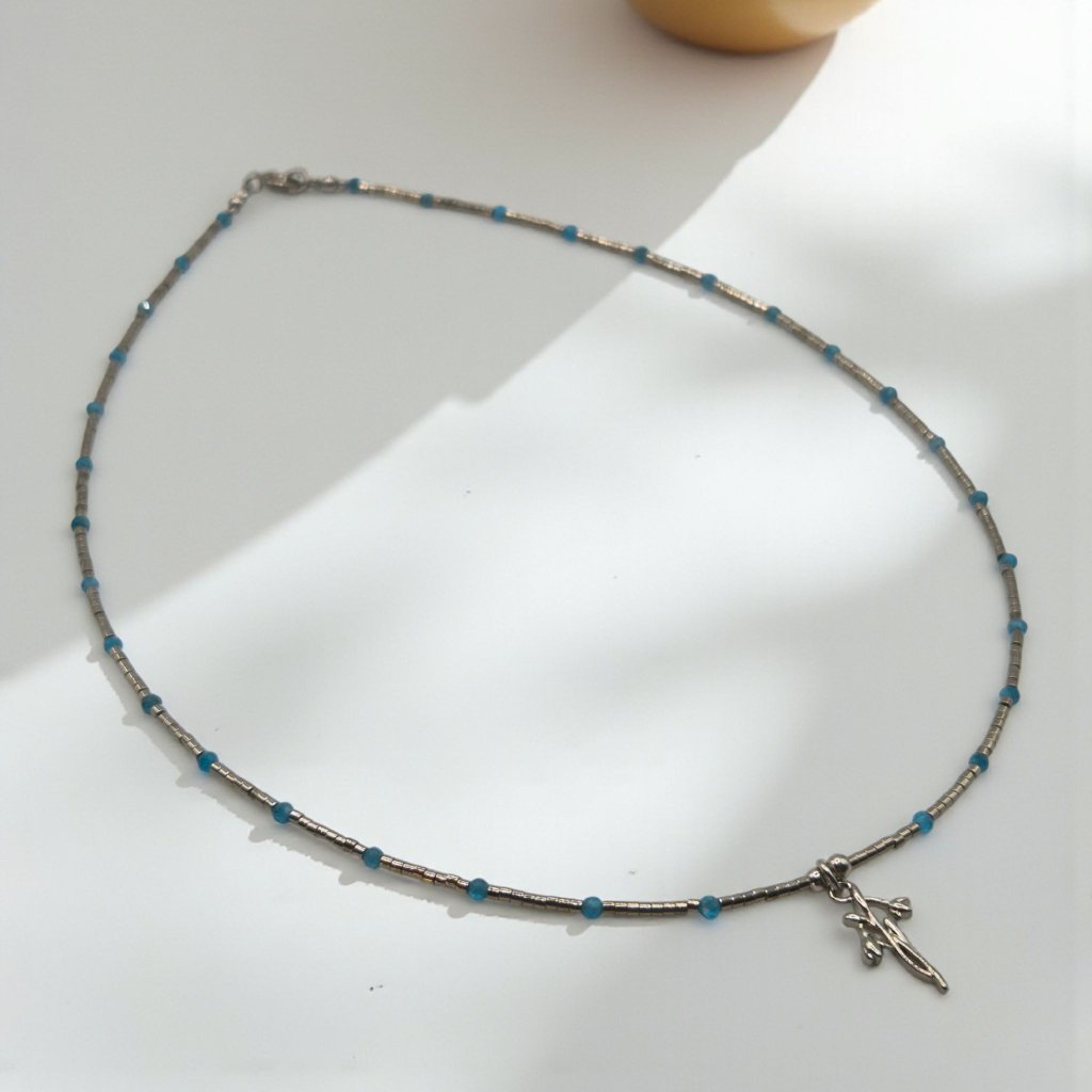 Apatit je minerál spojovaný s inspirací, jasnozřivostí a komunikací. Napomáhá uvolnit mentální napětí a podpořit kreativitu i vnitřní uvolnění. Použité broušené korálky o velikosti 2 mm pocházejí z Myanmaru a mají sytý tyrkysovo-modrý odstín s přírodním charakterem. Fasetovaný povrch dodává kamínkům jemný lesk, který v kombinaci s rhodiovanými komponenty působí elegantně a svěže.