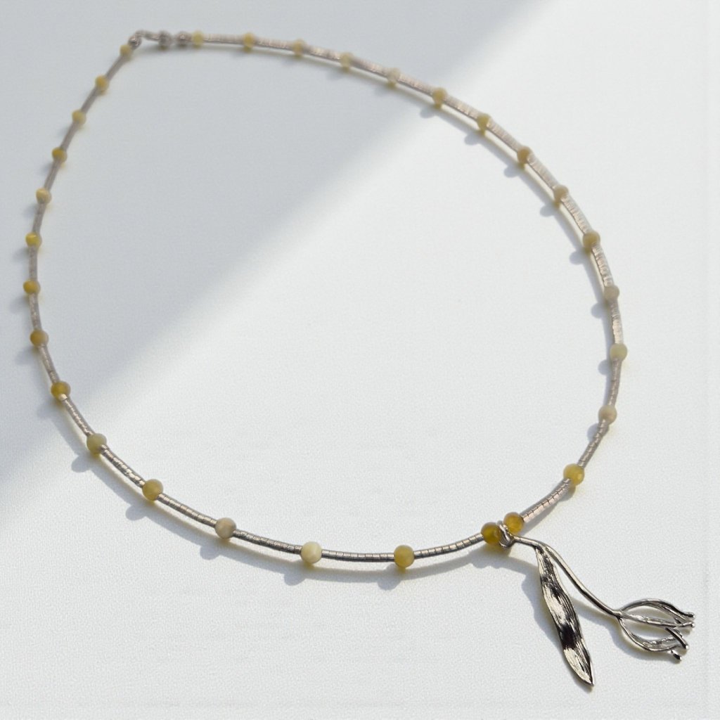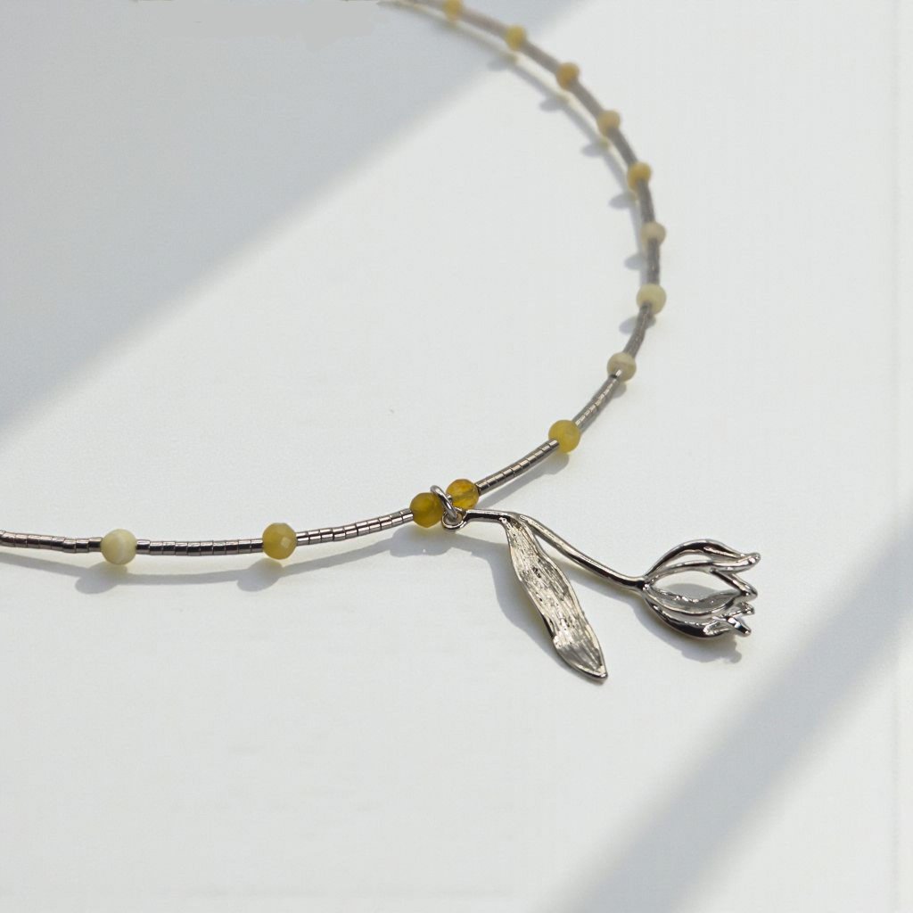 Jemný náhrdelník se žlutým opálem a květem plaménku. Šperk, který probouzí radost, světlo a vnitřní energii.